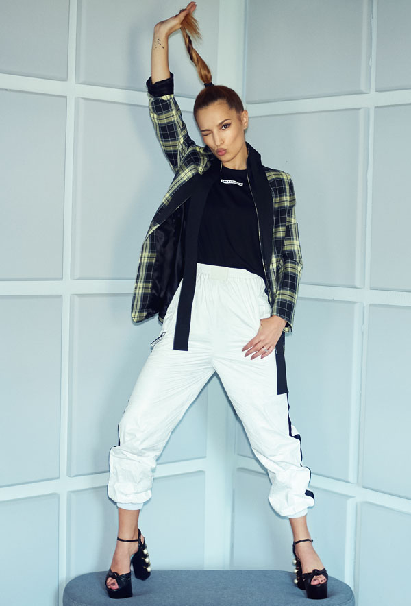 Minelli poartă sacou MM6 Maison Margiela, tricou Burberry, joggers Fiorucci, sandale Gucci.