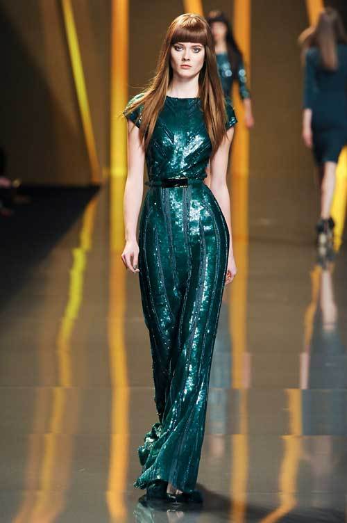 Ca sa eviti „the little black dress” intr-o seara in care vrei sa sochezi asistenta prin aparitia ta foarte fashion, alege o rochie lunga cu volan in talie, asemanatoare cu cea de la Vera Wang.
