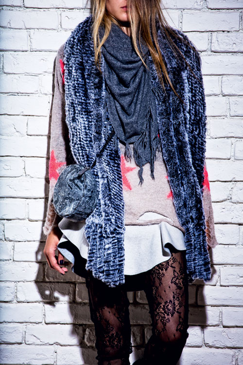 Top din bumbac si dantela, Share Spirit, 1.550 lei, si bocanci din piele, Guidi, 3.571 lei, ambele magazinul Entrance; pulover din lana, 199 lei, si caciula din lana, 39,90 lei, ambele H&M; top din piele, Ermanno Scervino, 7.097 lei; ciorapi din plasa, Dimensione Danza, 50 lei; jacheta din blana de vizon, 5.600 euro, magazinul Avanti Furs.