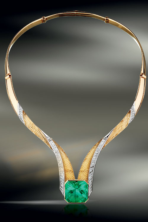 Colier din aur alb si galben, cu smarald, diamante si insertii de citrin, Scavia, cu pretul la cerere;