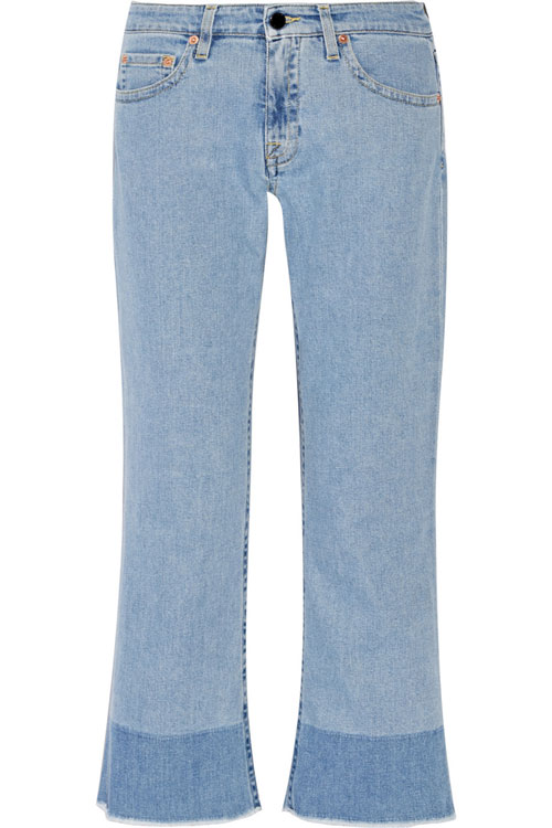 O pereche de sandale cu talpa din pluta in stilul anilor ’70 impreuna cu acesti jeansi iti vor lungi silueta si mai mult (Jeansi Frame Denim, 350 euro, www.net-a-porter.com)
