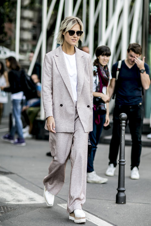 Costumul masculin – potrivit pentru un cocktail, poate inlocui clasica rochie neagra. Nu te gandi ca nu vei fi suficient de eleganta – cu ajutorul unei brose grafice si al unui clutch minimalist situatia se va rezolva instantaneu.