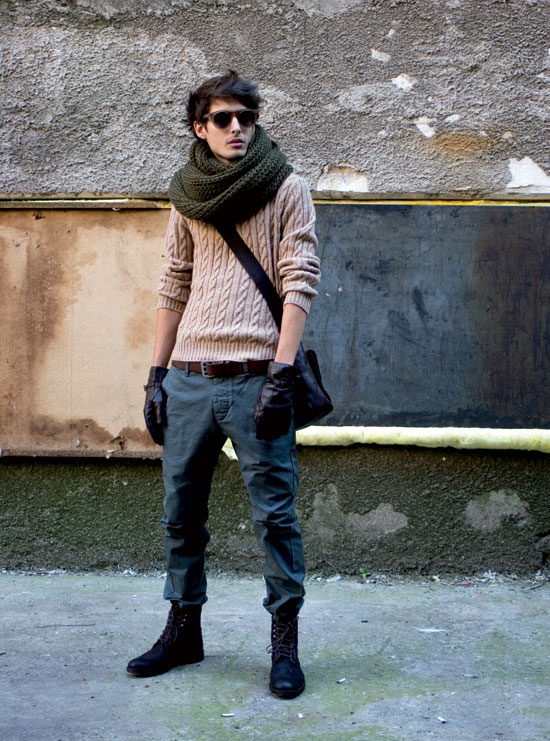 Pulover din lina, Prada, 1.770 lei, magazinul Mengotti; pantaloni din bumbac, Dsquared, 1.539 lei, magazinul Day&Night; fular din lina, Zara, 129 lei; ochelari de soare, Cutler&Gross, 1.090 lei, magazinul Entrance; geanta din piele Wichita, Louis Vuitton, 6.600 lei; manusi din piele, Belstaff, 442 lei; bocanci din piele intoarsa, Massimo Dutti, 499 lei.