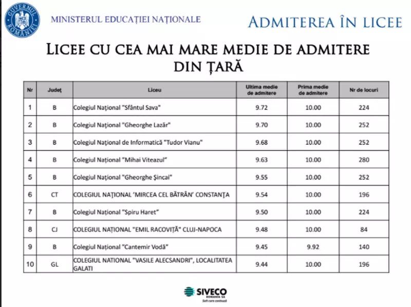 Sapte dintre liceele din TOP 10 se afla in Bucuresti, iar lista este completata de un liceu din Constanta, unul din Cluj si unul din Galati.