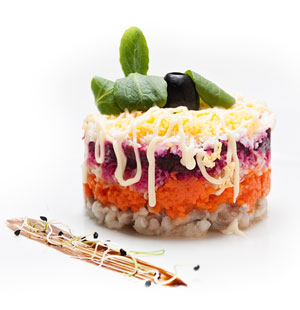 Meniul Cherie Saveurs de Russie este intesat de creatii culinare, care te fac sa iti doresti sa gusti din fiecare. Salatele si aperitivele, cunoscute la rusi sub denumirea generica zakuska', par sa fie inspirate din povesti cu tari rusi, unde mesenii se delectau cu clatite cu icre rosii, platouri de peste, canapeuri de hering servite cu legume variate sau pe clatite de cartof, pelmeni sau salate atat de consistente incat ar putea fi suficient pentru a te satura.