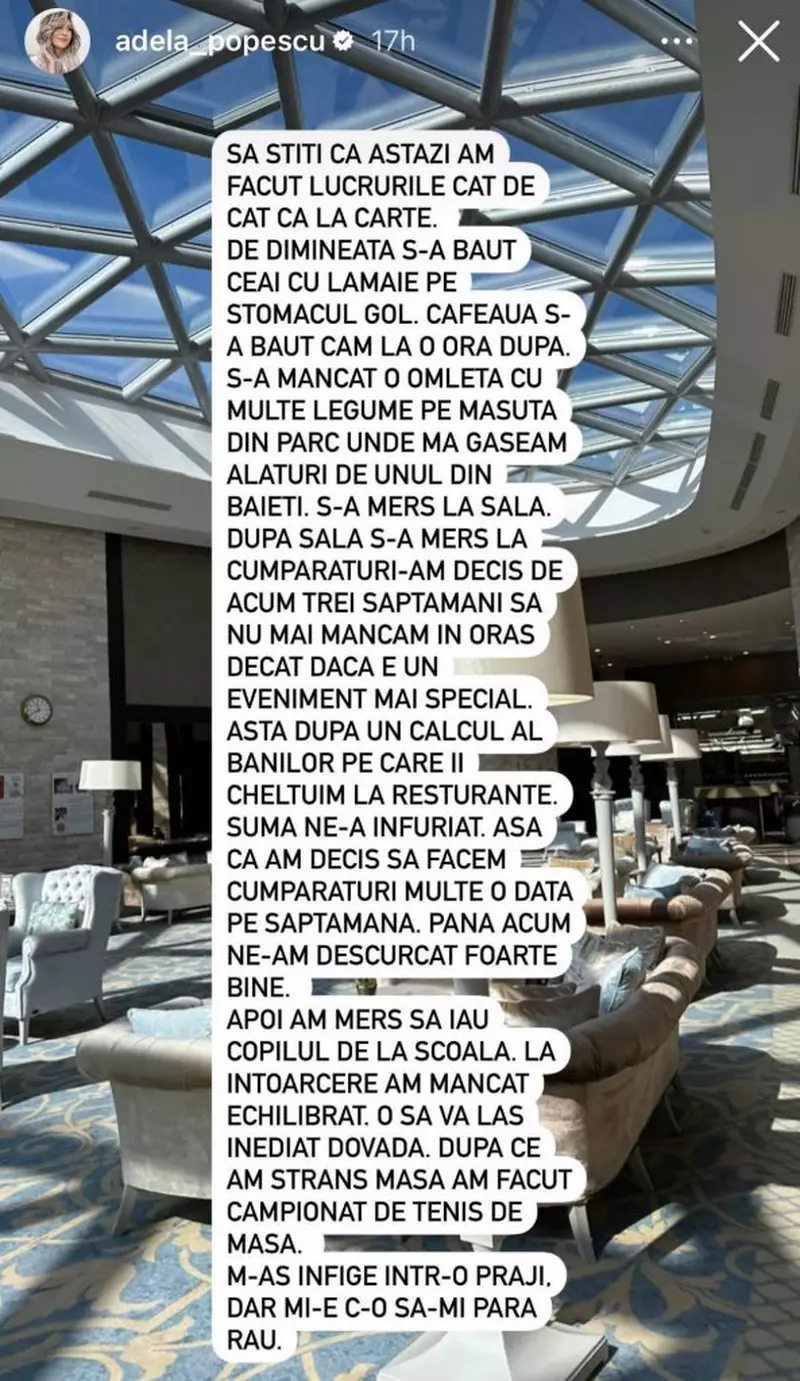 „Să știți că astăzi am făcut lucrurile cât de cât ca la carte. De dimineață s-a băut ceai cu lămâie pe stomacul gol. Cafeaua s-a băut cam la o oră după. S-a mâncat o omletă cu multe legume pe măsuța din parc unde mă găseam alături de unul din băieți. S-a mers la sală. După sală s-a mers la cumpărături. Am decis de acum trei săptămâni să nu mai mâncăm în oraș decât dacă e un eveniment mai special. Asta după un calcul al banilor pe care îi cheltuim la restaurante. Suma ne-a înfuriat. Așa că am decis să facem cumpărături mai multe o dată pe săptămână. Până acum ne-am descurcat foarte bine”, a povestit Adela Popescu pe Instagram.