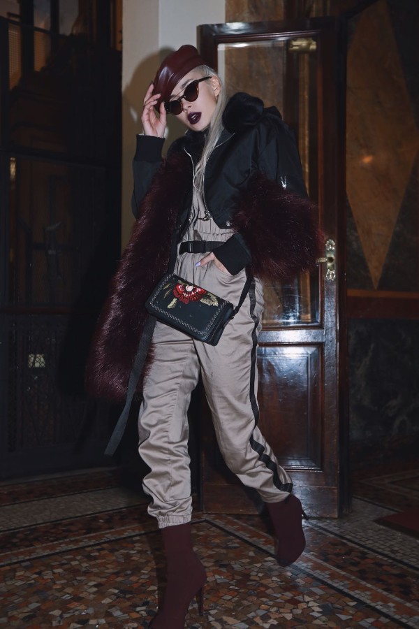 Salopetă: Ingrid Teodosiu Jachetă: Nympha Guler din blană ecologică: Adola Lucescu Geantă: Reserved Pantofi: Steve Madden Bască: Sweet Paprika