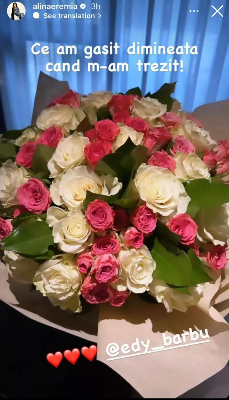 Alina Eremia s-a trezit astăzi cu un buchet superb de trandafiri albi și roz, din partea lui Edi Barbu, care a avut grijă ca ziua partenerei sale să înceapă perfect. Artista a fost impresionată de gestul făcut de iubitul ei și a postat o imagine cu buchetul pe pagina sa de Instagram.