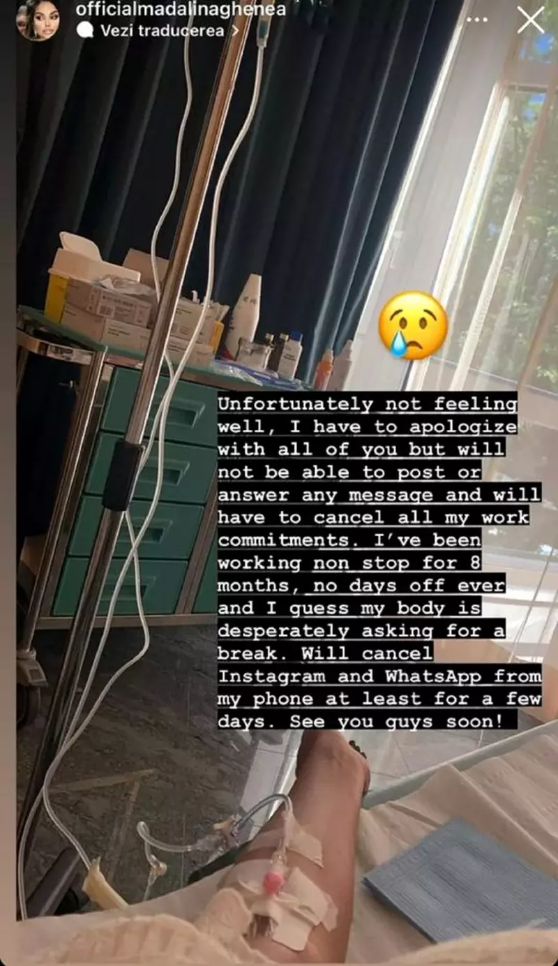 Mai mult chiar, românca a postat o imagine în care se poate observa că se află pe patul de spital și are perfuzii. Prin mesajul postat în limba engleză, Mădălina Ghenea le-a transmis fanilor că este nevoită să își anuleze toate proiectele stabilite pentru următoarea perioadă.