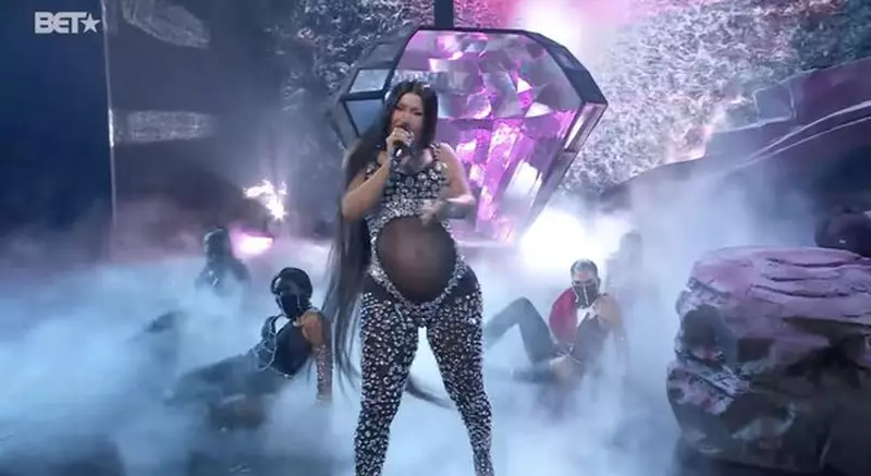 Anunțul a fost coregrafiat cu atenție. În timp ce starul a urcat pe scenă, purtând o salopetă acoperită de strasuri, cu o porțiune neagră, transparentă, cât să se vadă prin ea burta de gravidă, echipa ei de PR a trimis un comunicat prin care dădea vestea. Cu ocazia asta, au postat în social media o fotografie nud în care Cardi, pozată din profil, are sânii și burta acoperite într-un soi de ipsos, de parcă ar fi pe cale să devină o sculptură.
