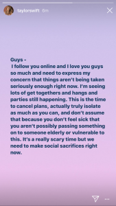 Taylor Swift a publicat pe Instagram Story un mesaj prin care își roagă urmăritorii să se izoleze. „Dragii mei, vă urmăresc în online și vă iubesc atât de mult și trebuie să îmi exprim îngrijorarea față de lucrurile care nu sunt luate în serios în acest moment. Văd o mulțime de întâlniri și de petreceri care încă mai au loc. Este momentul să vă anulați planurile, să vă izolați cât de mult puteți și să nu vă gândiți să nu faceți asta doar pentru că nu sunteți bolnavi. Este un moment terifiant pentru noi toți, dar trebuie să facem un sacrificiu chiar în acest moment.”
