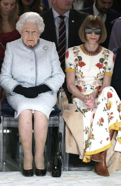 Regina Angliei și-a făcut apariția la London Fashion Week în compania Annei Wintour. Un expert al etichetei regale a afirmat că Anna Wintour a făcut o încălcare gravă purtând ochelari de soare în interior în timp ce vorbea cu Majestatea Sa. "Doamna Wintour ar fi trebuit să știe că este inacceptabil să porți ochelari de soare atunci când vorbești cu cineva, dacă nu ai modive medicale, " a declarat Grant Harrold.