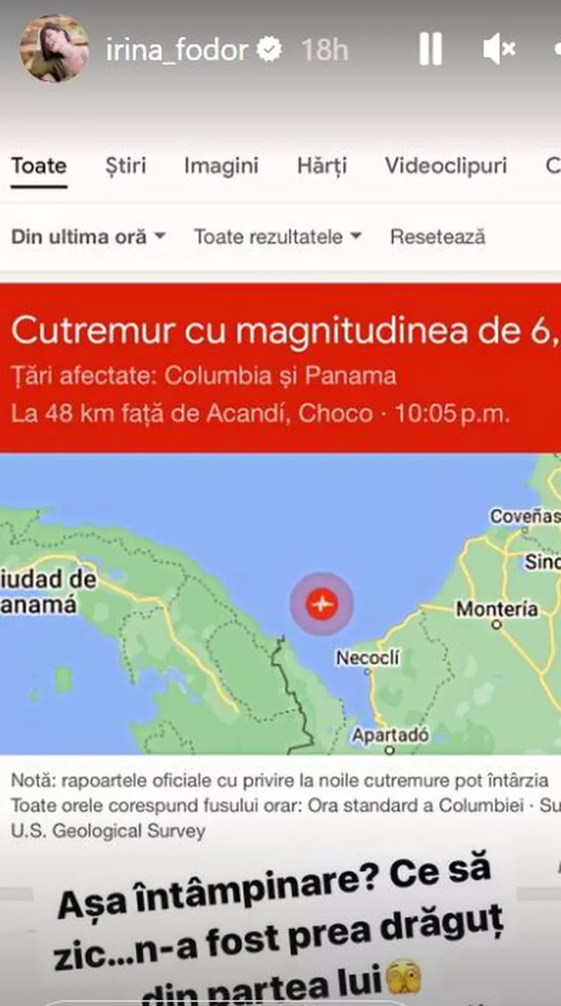 Irinei Fodor a anunțat pe contul ei personal de Instagram faptul că a fost surprinsă de un cutremur cu magnitudinea de 6,6 grade. În spirit de glumă, aceasta a scris că nu a fost tocmai încântată de această „întâmpinare”, iar somnul ar putea deveni o problemă după experiența trăită.