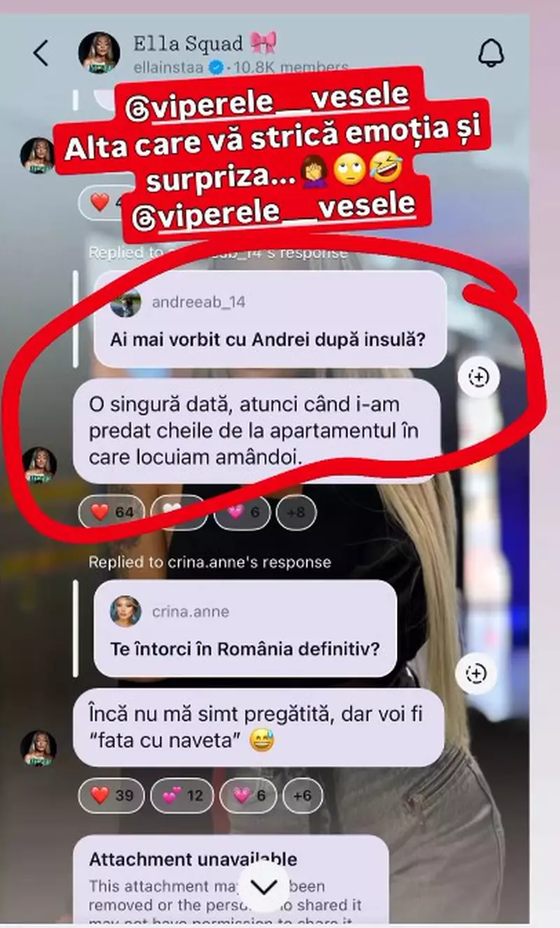Pe lângă acest incident, ea a continuat discuția pe același canal, răspunzând unui fan care a amintit că Andrei, fostul său partener, a avut un comportament pozitiv într-un live recent, în ciuda tensiunilor și trădării din timpul emisiunii. Replica Ellei a fost directă și acidă: