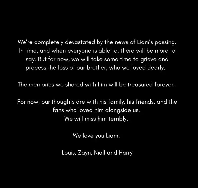 „În timp, și când toată lumea va fi capabilă, vor fi mai multe de spus. Dar pentru moment, ne vom lua ceva timp pentru a plânge și a procesa pierderea fratelui nostru, pe care l-am iubit foarte mult. Amintirile pe care le-am împărtășit cu el vor fi prețuite pentru totdeauna. Pentru moment, gândurile noastre sunt cu familia sa, prietenii săi și fanii care l-au iubit alături de noi. Ne va lipsi teribil. Te iubim Liam – Louis, Zayn, Niall și Harry.”