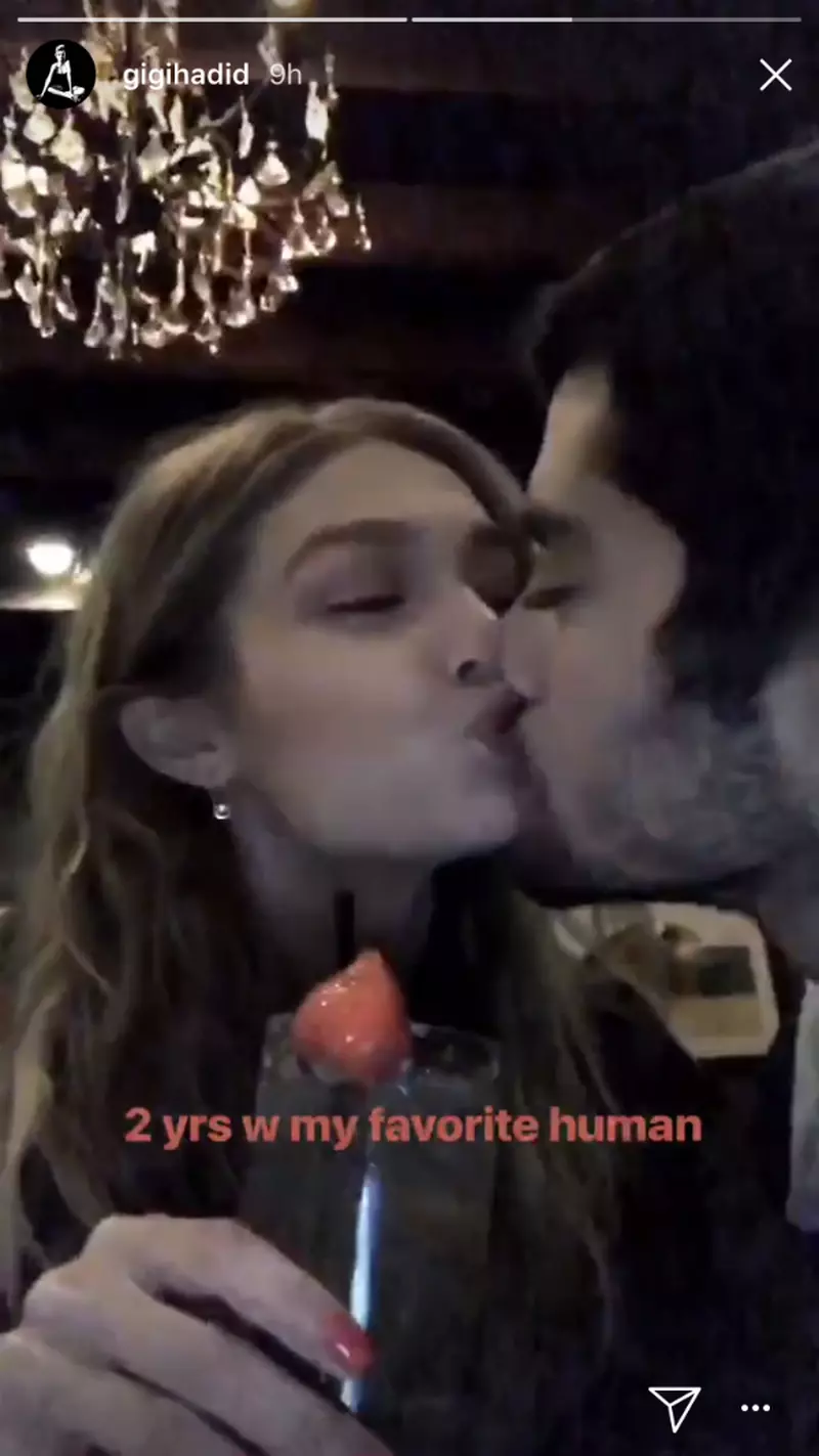 Gigi Hadid a share-uit cu fanii sai un Instagram Story in care ea si cu Zayn se saruta, scriind in josul imaginii: „2 ani cu omul meu preferat”.