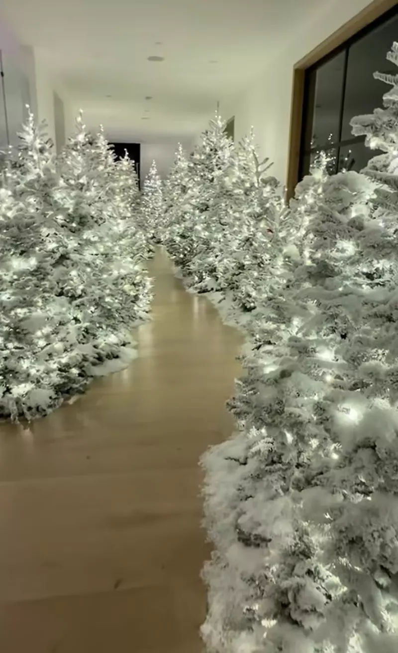 „Tocmai am terminat de decorat pentru sărbători,” a spus ea, în timp ce filma nenumărații brazi acoperiți de zăpadă artificială, aranjați de-a lungul holurilor. ‘Nici nu pot să vă explic ce miros și ce atmosferă este aici.” Kim Kardashian a descris decorul drept „nebunesc”, arătând șirurile de brazi împodobiți cu lumini, inclusiv un grup de brazi instalați în bucătărie.