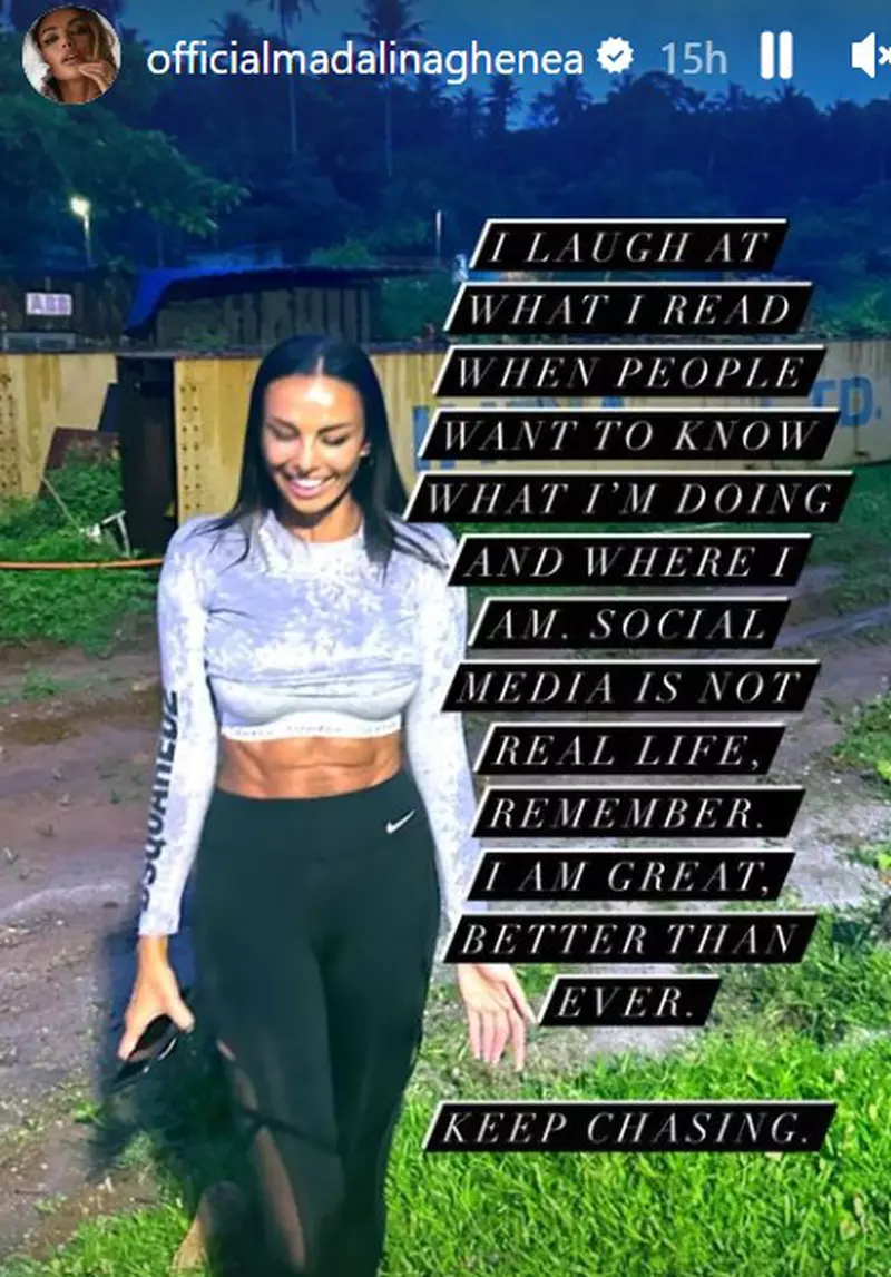 „Râd la ceea ce citesc atunci când oamenii vor să știe ce fac sau unde sunt. Social media nu reprezintă viața reală, nu uitați. Sunt foarte bine, mai bine ca niciodată. Keep chasing”, a transmis vedeta pe Instagram.