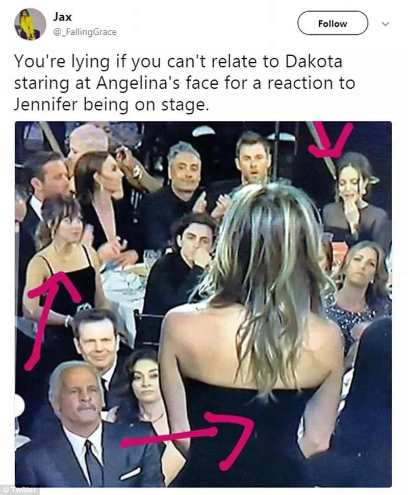 După deja virala imagine cu Dakota Johnson urmărind cu colțul ochiului reacția Angelinei atunci când pe scenă era Jennifer Aniston, iată că o nouă fotografie face deliciul – sau îngrijorarea – fanilor.