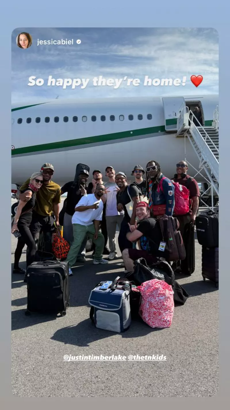Soția starului pop în vârstă de 44 de ani, Jessica Biel, a postat și ea pe Instastory o fotografie cu el și echipa sa lângă un avion privat pe pistă, pe care a descris-o cu mesajul: „Sunt atât de fericită că au ajuns acasă!”.