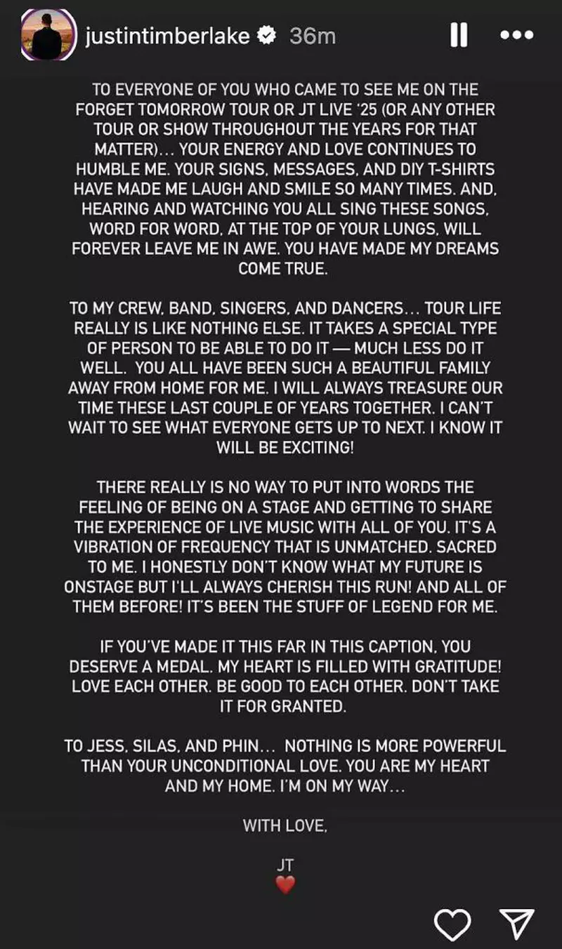 Justin Timberlake a apărut pe social media într-o ipostază casual, purtând o bluză sport și a declarat pe Instastory, luni, că „nu face nimic azi” după ce a „dus la bun sfârșit misiunea” de a încheia turneul mondial The Forget Tomorrow, care a cuprins 121 de concerte și a generat încasări de 205,2 milioane de dolari.
