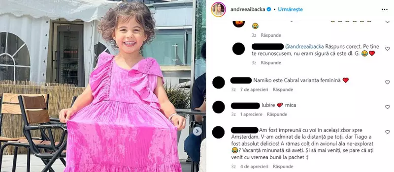 „Am fost împreună cu voi în același zbor spre Amsterdam. V-am admirat de la distanță pe toți, dar Tiago a fost absolut delicios! A rămas colț din avionul ală neexplorat? Vacanță minunată să aveți. Și să mai veniți, se pare că ați venit cu vreme bună la pachet”, a fost mesajul primit de Andreea Ibacka pe Instagram.