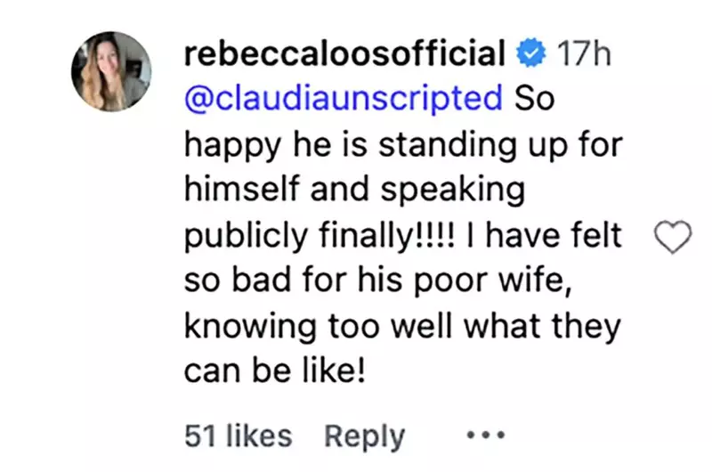 „Sunt atât de fericită că, în sfârșit, are curajul să se apere și să vorbească public!!!! Mi-a părut foarte rău pentru soția lui, știind prea bine cum pot fi ei!”, a scris Rebecca Loos într-un comentariu la cea mai recentă postare a sa de pe Instagram, făcând referire la Nicola Peltz, soția lui Brooklyn.