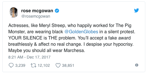 Inițial, McGowan a scris sâmbătă: „Actrițe precum Meryl Streep, care au lucrat pentru «The Pig Monster», se îmbracă în negru la Golden Globes, în semn de protest silențios. TOCMAI TĂCEREA TA ESTE PROBLEMA! O să accepți un premiu fals, fără să respiri, și nu o să te sinchisești să produci vreo schimbare. Disprețuiesc ipocrizia de care dai dovadă. Poate ar fi mai bine să purtați toate Marchesa.