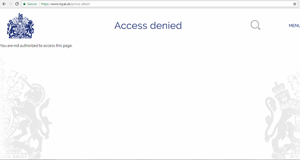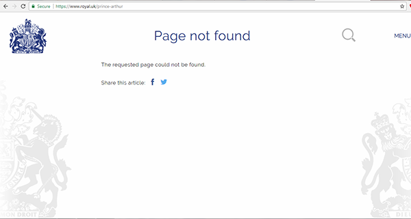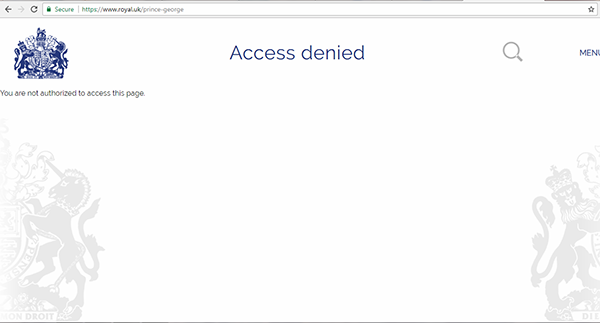 Dacă încerci să accesezi paginile create pentru Prințul George și Prințesa Charlotte, ceilalți copii ai cuplului regal (adică dacă scrii royal.uk/prince-george sau royal.uk/princess-charlotte) îți va apărea următoarea pagină – acest lucru înseamnă că paginile sunt create, deci există, dar nu sunt încă publicate pentru ca toată lumea să le vadă.