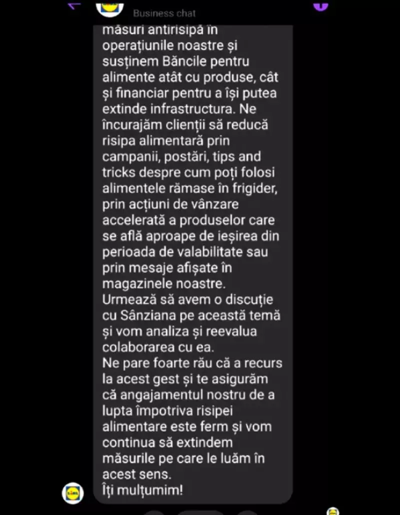 „Am aflat cu tristețe, din social media, despre gestul Sânzianei şi al partenerului ei, pe care nu ni-l explicăm. Lidl este partener fondator al Rețelei Băncilor pentru Alimente, iar combaterea risipei alimentare este un pilon foarte important al strategiei noastre de sustenabilitate. Implementăm constant măsuri antirisipă în operațiunile noastre şi susținem Băncile pentru alimente atât cu produse, cât si financiar pentru a îşi putea extinde infrastructura.