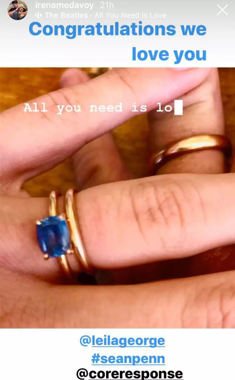 „Suntem extrem de fericiți pentru căsătoria dintre @leilaeorge și #seanpenn”, a scris Irena Medavoy, o prietenă apropiată a celor doi actori, într-o postare pe Instagram, adăugând și o fotografie mai veche a cuplului proaspăt căsătorit, postare care între timp a fost ștearsă de pe Instagram.