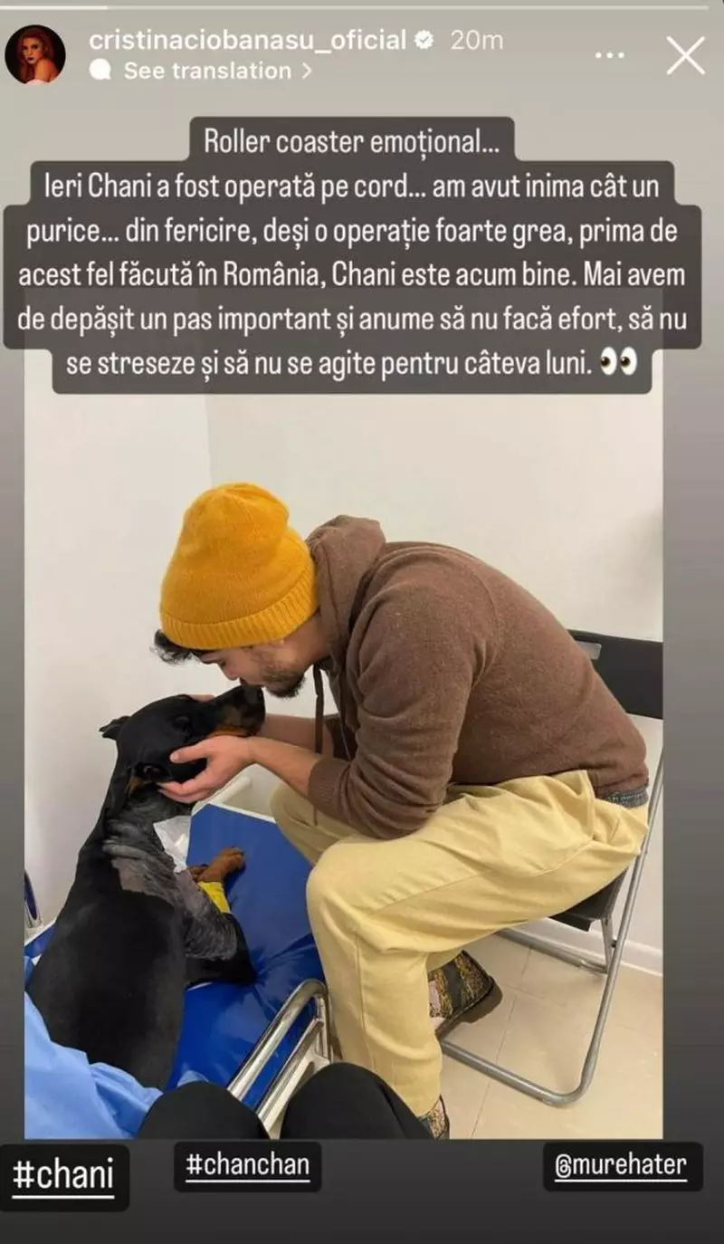 „Roller coaster emoționant… Ieri Chani a fost operată pe cord… am avut inima cât un purice… din fericire, deși o operație foarte grea, prima de acest fel făcută în România, Chani este acum bine. Mai avem de depășit un pas important și anume să nu facă efort, să nu se streseze și să nu se agite pentru câteva luni”, a scris Cristina Ciobănașu pe InstaStory.
