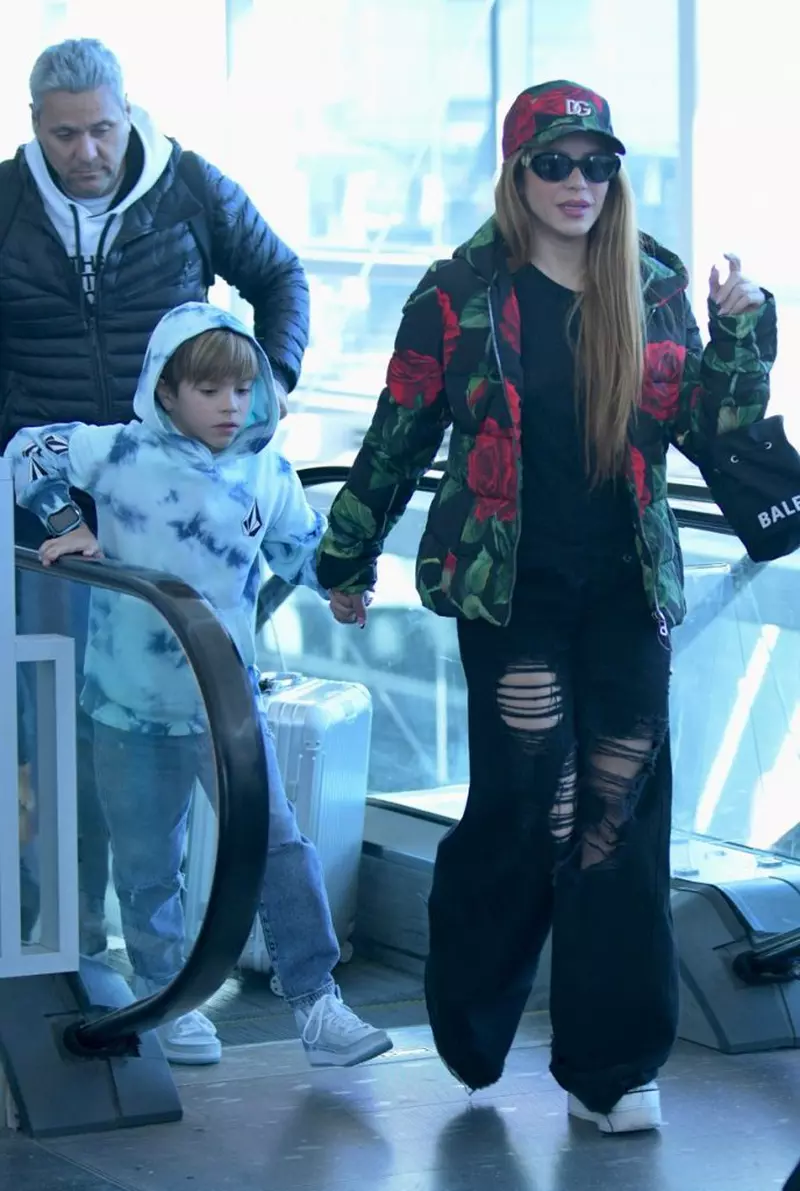 Artista a purtat un tricou negru, combinat cu o pereche de blugi negri rupți și pantofi de sport albi. Pentru a ține frigul la distanță, ea a ales să se îmbrace într-o jachetă neagră căptușită, cu trandafiri roșii. Shakira a adăugat o șapcă de baseball cu trandafiri asortată și și-a ascuns privirea în spatele unor ochelari de soare. De asemenea, cei doi băieți ai ei s-au asortat unul cu celălalt în hanorace albastre, blugi deschiși la culoare și adidași albi.