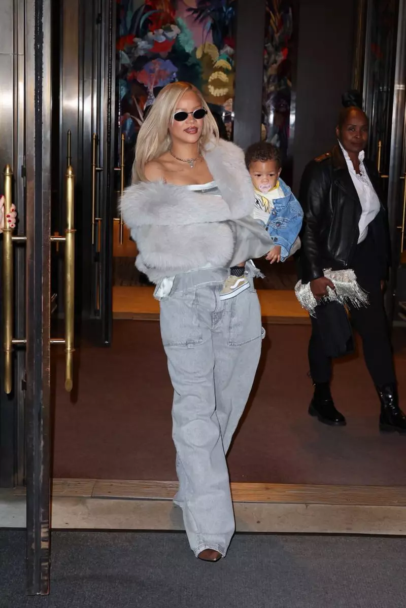 Artista, în vârstă de 36 de ani, a zâmbit în timp ce își înfășura brațele în jurul fiului său mai mic, în vârstă de opt luni, Riot, și îl sprijină pe șoldul ei. Câștigătoarea premiului Grammy a arătat chic în pantaloni largi din denim gri, o cămașă de mătase argintie fără bretele și o jachetă gri supradimensionată din blană. Ea și-a accesorizat ținuta cu pantofi cu toc de culoare metalică, ochelari de soare în formă ovală și un colier argintiu.