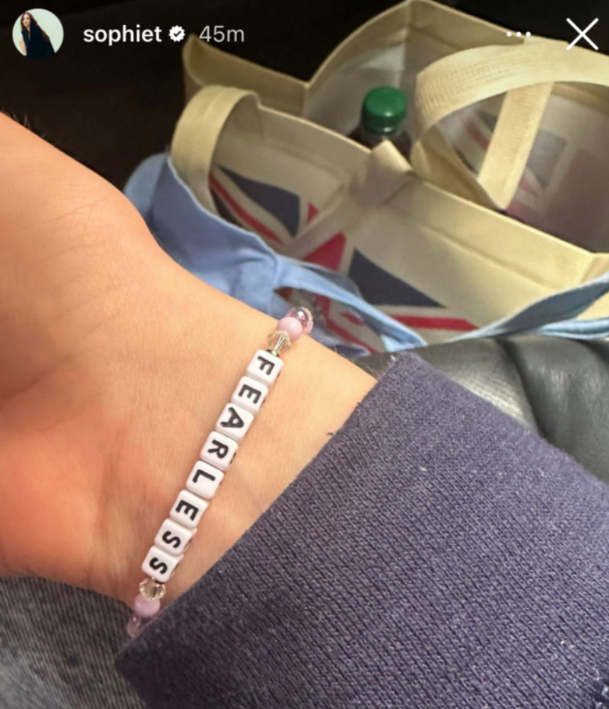 În tot acest contex tumultuos, prima postare a lui Sophie Turner, un story de Instagram, a venit ca un avertisment și ca o luare de atitudine. Actrița cu care s-au solidarizat femei din toată lumea a postat pe contul său o imagine care ar putea fi interpretată atât drept jucăușă, cât și amenințătoare. Și asta pentru că imaginea îi înfățișa mâna, de care era prinsă o mică brățară din plastic cu elemente pe care sunt imprimate litere, formând cuvântul „fearless”, adică „neînfricată”. Astfel de brățări au recăpătat o popularite uriașă în acest an, mai ales în contextul turneului susținut de Taylor Swift, care s-a dovedit unul dintre cele mai profitabile din istorie.
