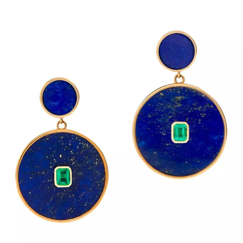 Eleganți și aparte, cerceii lungi CASIANI ABSOLUTE cu Lapis Lazulli și Smarald, prezintă două smaralde, două discuri de 10mm din lapis lazulli și două discuri de 25mm din lapis lazulli natural, încastrate în aur galben de 18k.