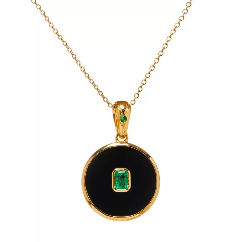 Pandantivul CASIANI ABSOLUTE cu Onix și Smaralde este o bijuterie elegantă, prezentând două smaralde și un disc de 15mm din onix natural, încastrat în aur galben de 18k