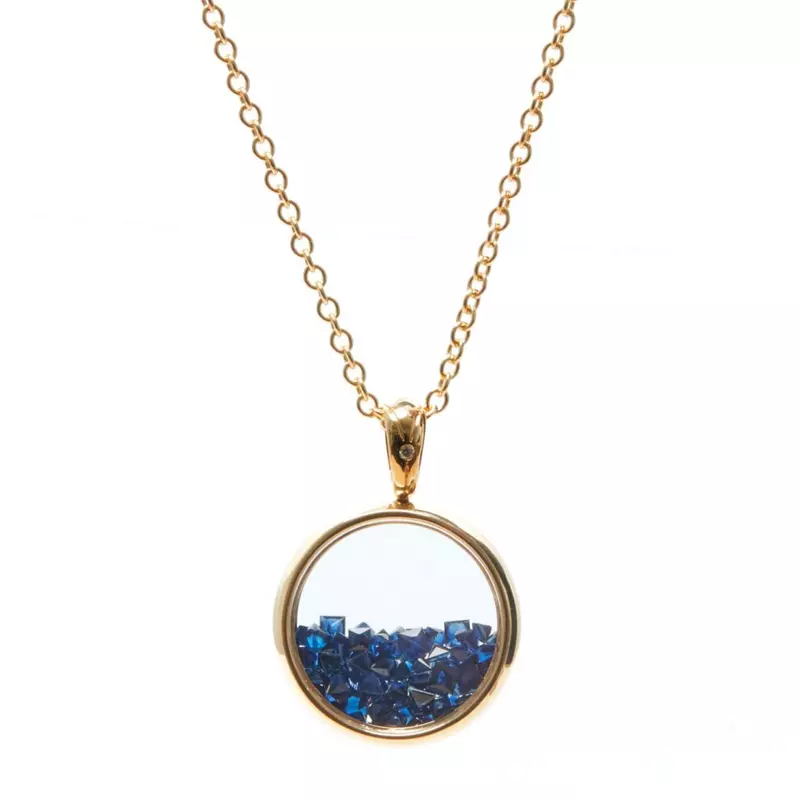 Pandantivul CASIANI TANDEM cu Safire și Diamante este o bijuterie specială, lucrată cu minuțiozitate: un pandantiv mobil alcătuit din două sticle de safir cu diametrul de 20mm sigilate de un cerc de aur galben de 18k, în interiorul astfel creat fiind prezentate safire albastre de diferite forme și mărimi în liberă mișcare. Două diamante totalizând 0.04ct sunt încastrate pe ambele fețe ale agățătorii.
