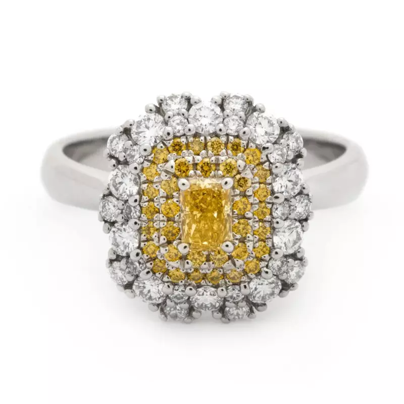 Inelul CASIANI DIAMONDS din aur alb de 18k este o bijuterie unică, elegantă și care atrage toate privirile. Prezintă ca și piatră centrală un diamant galben cu tăietură radiant de 0.26 ct. înconjurat de diamante galbene cu tăietură rotundă însumând 0.15 ct. și diamante albe (0.54 ct.)